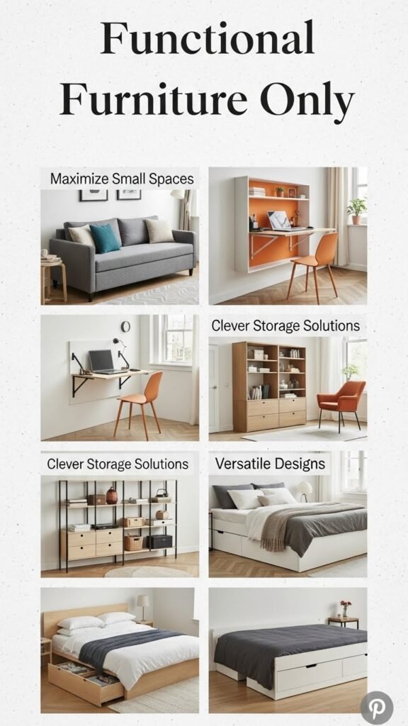 Opt for built-in wardrobes, under-bed storage, or hidden drawers. Keep surfaces like nightstands and dressers mostly clear, displaying only one or two essential items.