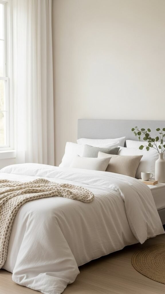 Minimalist bedding should feel soft, comfortable, and visually calm. Solid-colored bedding in white, beige, grey, or muted earth tones works best. Linen and cotton fabrics add a natural texture without adding clutter.