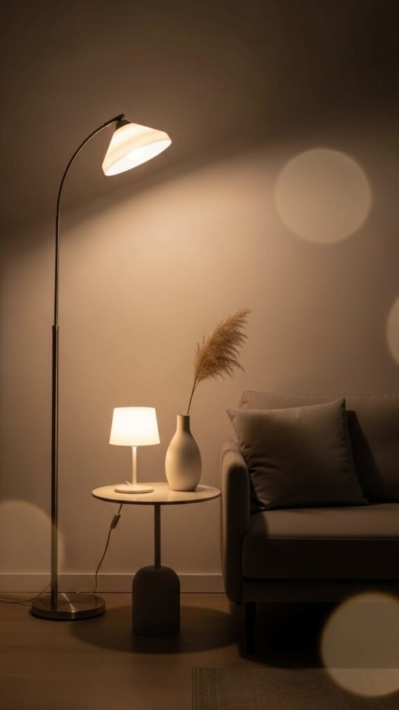 Warm lighting creates a cozy atmosphere, while sleek fixtures in black, brass, or white maintain a modern aesthetic. Avoid overly decorative lampshades and stick to clean shapes.