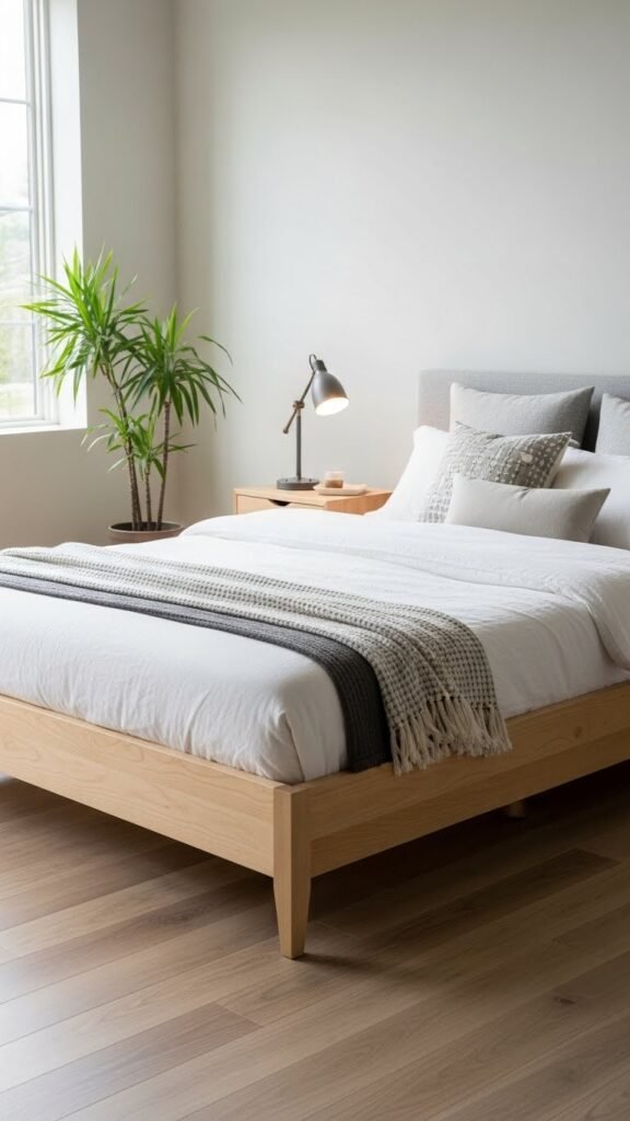 Minimalist bedrooms can feel cold if not styled carefully. Adding natural materials like wood, linen, jute, or stone helps bring warmth and balance.